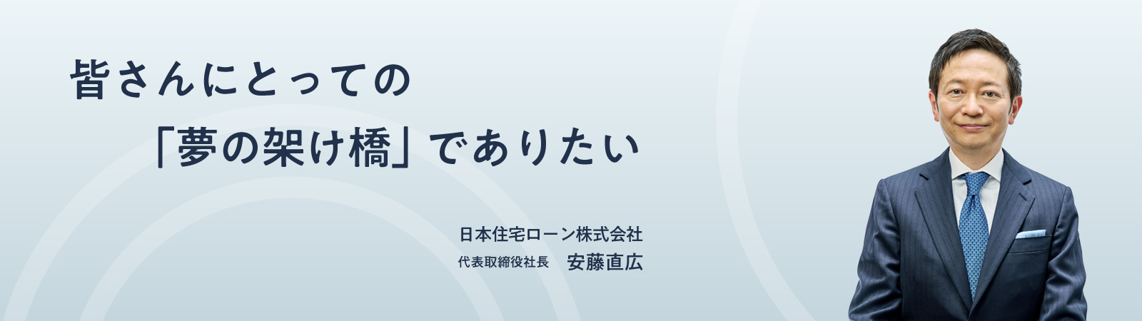 当社がお手伝いさせていただくことで、多くのお客さまに住宅という「宝」を手に入れてもらえることは、当社にとって至上の喜びです。そのため、当社ではお客さまのご意見・ご要望を広く取り入れ、ご安心いただけるローン商品ときめ細かいサービスをご提供することに全力を傾けております。今後も、住宅ローン専門金融機関として、より信頼性と利便性の高いローン商品やサービスの開発に積極的にチャレンジし、お客さまが住宅取得という「夢」を実現していただけるよう、できる限り貢献していきたいと考えております。どうか引き続き温かいご支援・ご指導を賜りますよう、お願い申し上げます。